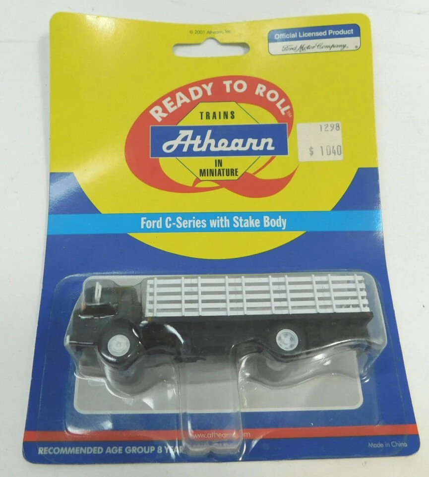 An Athearn HO Ford C-Series with Stake Body, #2725. Cab and frame are black, wheels and fences are white.