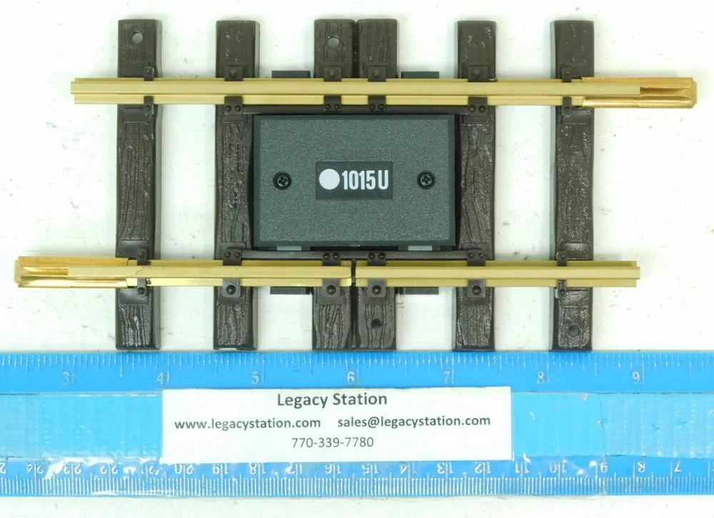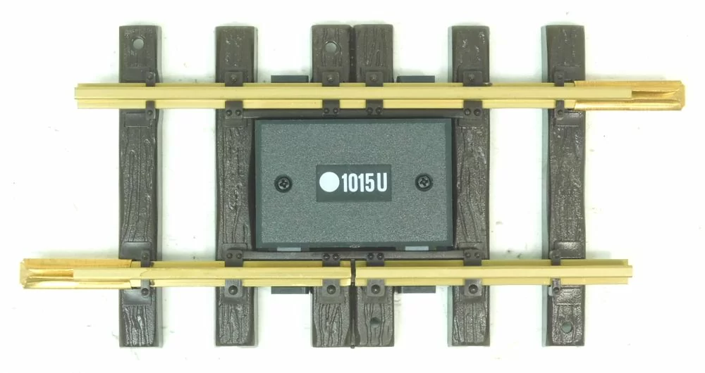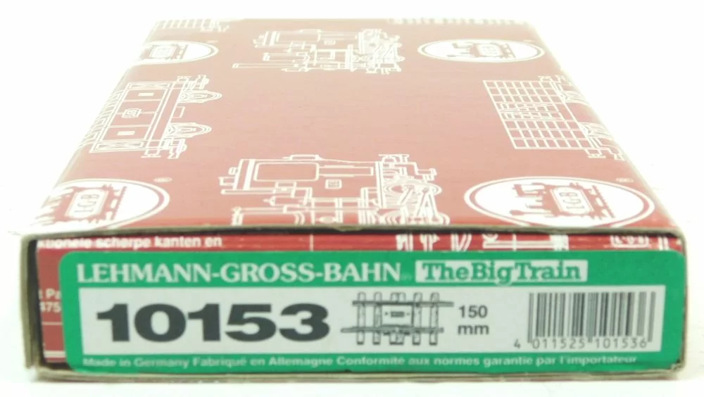 An LGB #10153 Straight Interrupter Track Section.  One rail is interrupted or gapped on this section of track. The interrupter track can be used for the circuit for an insulated block in front of signals. A hidden terminal clip facilitates electrical connections.  150mm straight piece, used, with little to no wear, and comes in the original box. Item may differ from image.