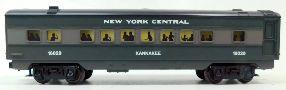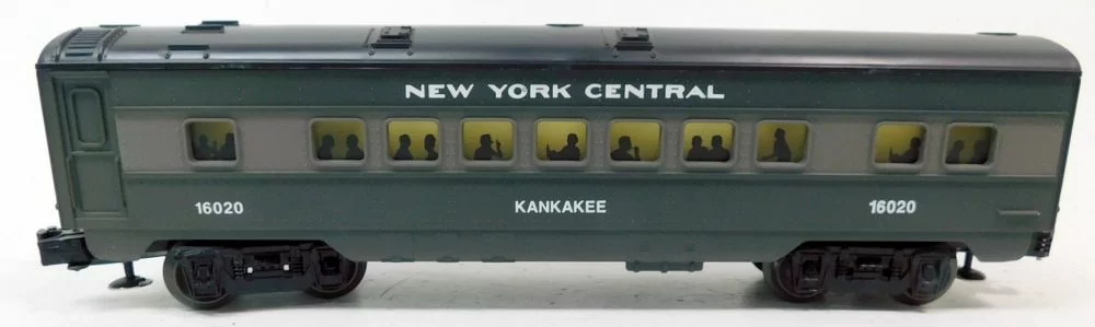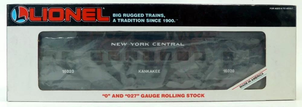 A Lionel passenger car, 6-16020 New York Central Coach Car “Kankakee“. Used, like new condition with low runtime, in original box. No damage or rust, with clean paint and markings. Features working interior lights, plastic trucks, and operating couplers. Box is intact, with no damage or fading.