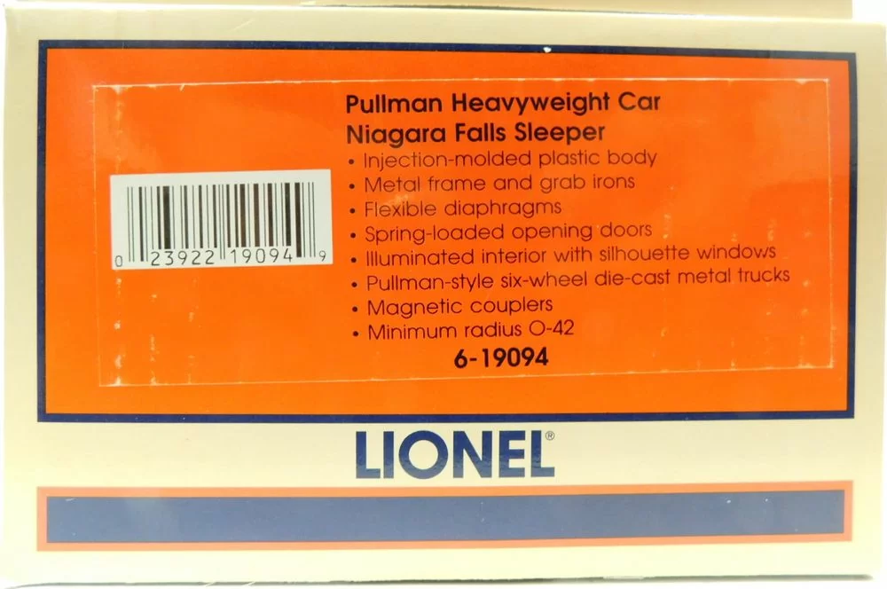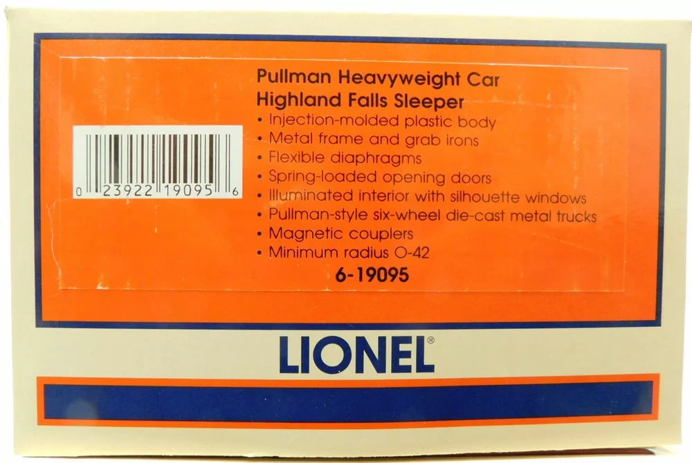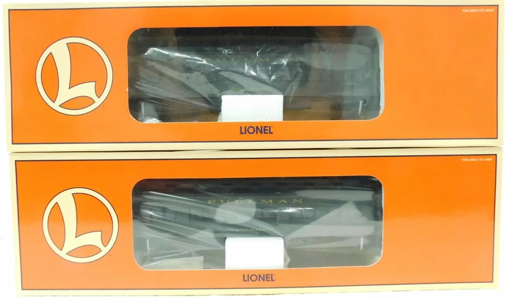 A Lionel 2-car passenger set, 6-19093 Commodore Vanderbilt Pullman heavyweight sleeper cars. Included are 6-19094 Niagara Falls and 6-19095 Highland Falls. Cars are new in box, never ran. Each features opening passenger doors, die-cast six-wheeled metal trucks, flexible diaphragms, interior lights, and operating couplers. Boxes are intact, and come in the original shipping box.