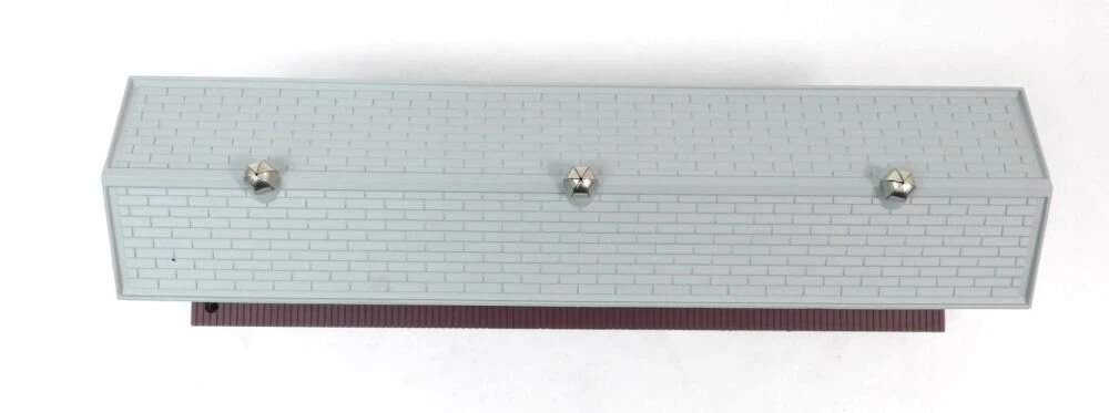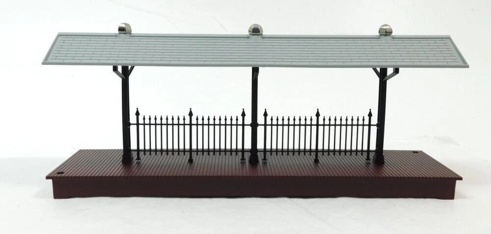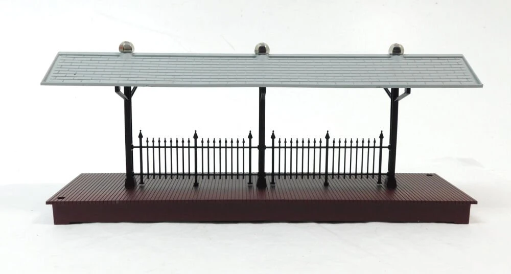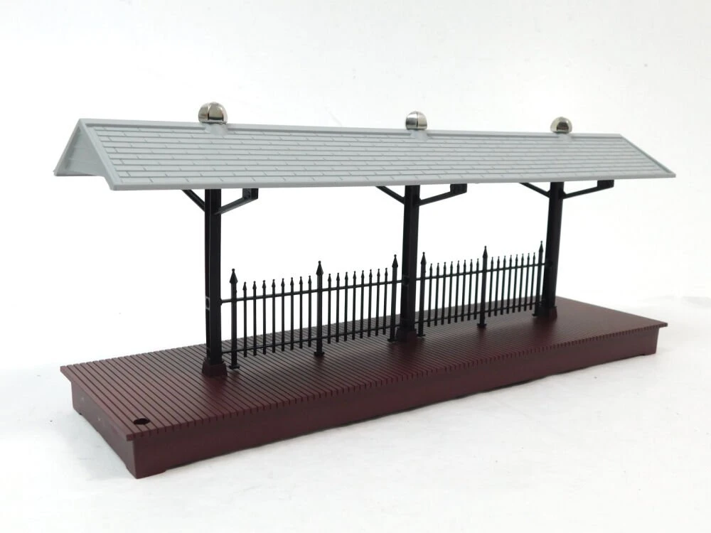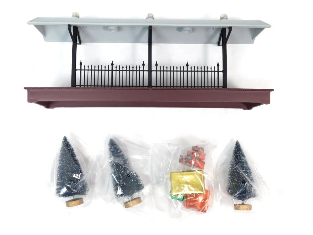 This is an “O” gauge station platform with three(3) decorative winter trees, and presents. All decorative items are sealed in their original packaging. The station shows signs of minimal use with no marks, knicks, or smudges. This item is stored in its original packaging.