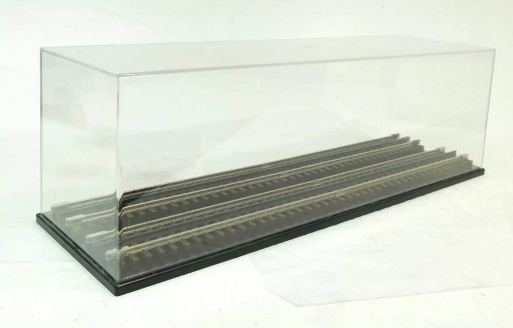 This is a display case with roughly 2 sets of 20″ Atlas O track. The clear acryclic sides may have scratches on them. The copper/brass center rail may be shining through.